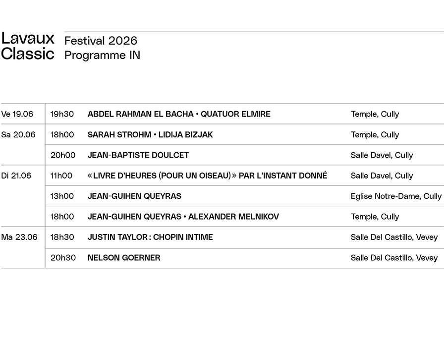 Lavaux Classic est un festival de musique classique créé en 2004 et doté d’une identité singulière qui lui assure une forte notoriété régionale et internationale. Il se définit par une programmation exigeante où se côtoient harmonieusement artistes de renommée mondiale et jeunes talents locaux. Prisé des grands artistes de notre temps comme Grigory Sokolov, Steven Isserlis, Marina Viotti, István Várdai ou le Quatuor Modigliani, Lavaux Classic doit son succès à son profil dynamique, insolite et exigeant.
